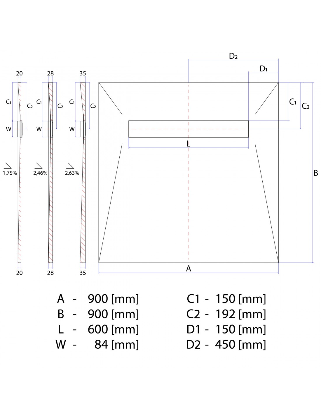 - Eine Plattenstärke von 35 mm ist die dickste verfügbare Stärke mit einem steileren Gefälle, höherer Schalldämmung und robusteren Oberfläche. Es eignet sich für größere Duschbereiche mit einer Längenseite ≥ 120 cm.