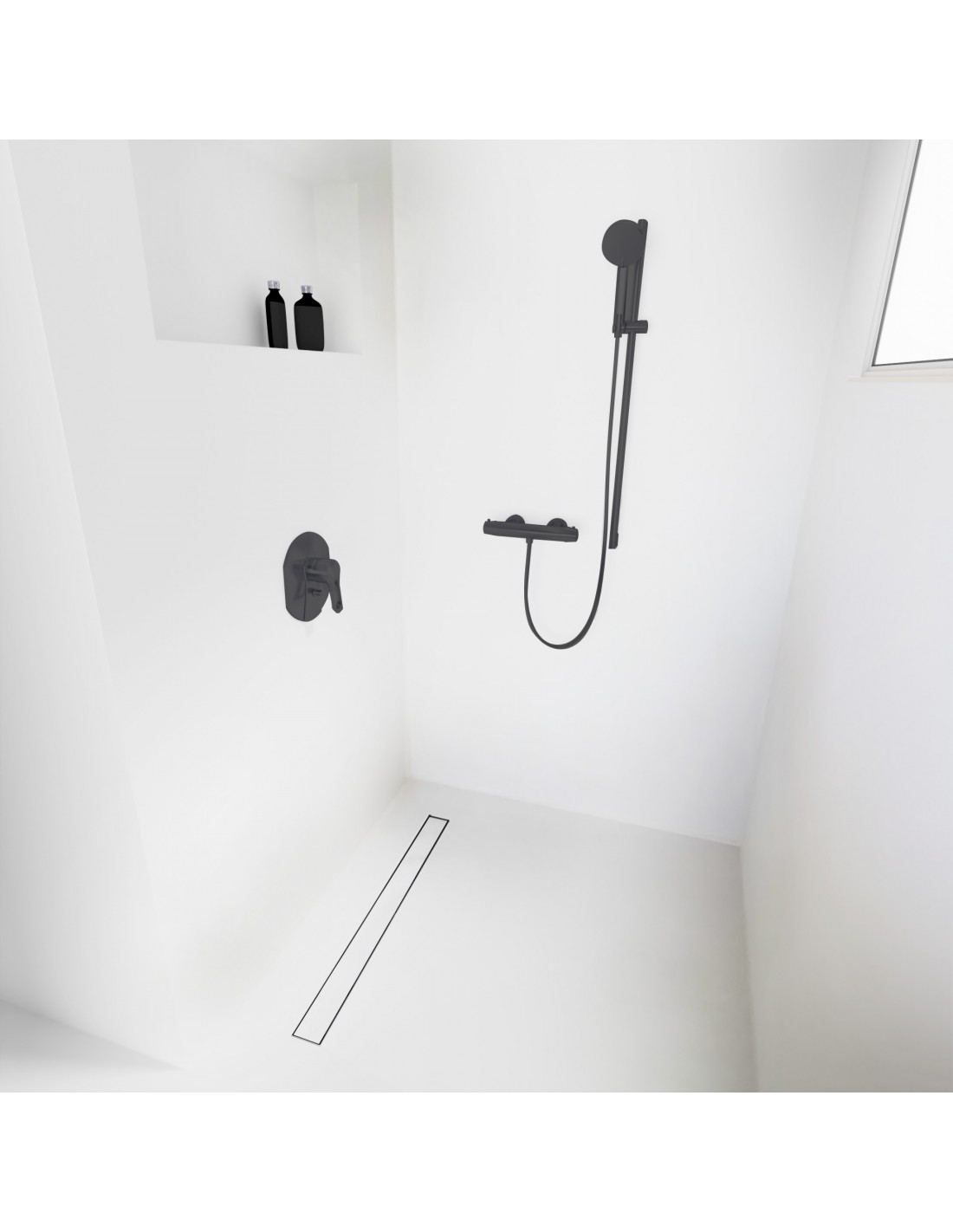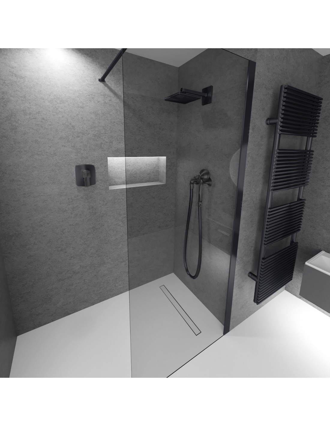 Duschelement für Mikrozement 80 x 80 cm 4-seitiges Gefälle mit Rinne Wiper Resinbase MCR PVD Pure Black