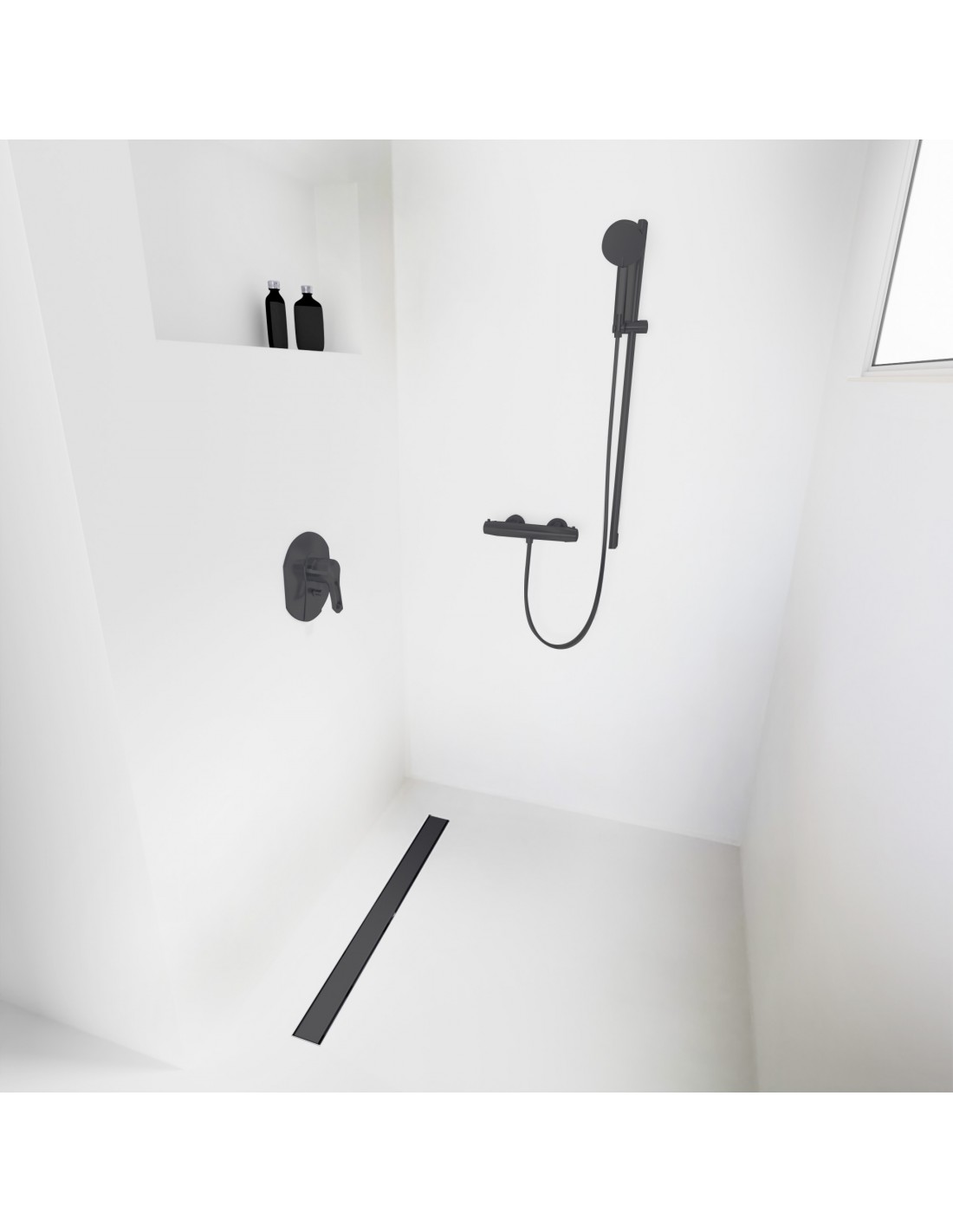 Duschelement für Mikrozement 80 x 80 cm 4-seitiges Gefälle mit Rinne Wiper Resinbase MCR PVD Reversible Black