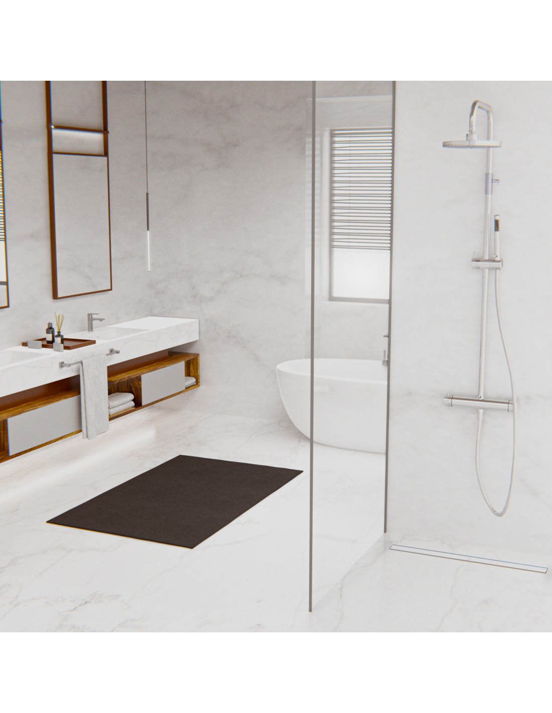 - Material und Struktur: Das Basismaterial des Duschboards besteht aus robustem XPS-Hartschaum mit beidseitiger Beschichtung aus flexiblem Zementmörtel und Glasfasergewebe. Zusätzlich ist es vollflächig mit einer PE-Dichtmembrane versehen und sorgt für eine erhöhte Wasserabweisung. Die Duschrinne ist aus Edelstahl AISI 304, gem. DIN EN 10088, gefertigt (316 auf Anfrage). Die Siphons sind aus Polypropylen (PP) hergestellt.