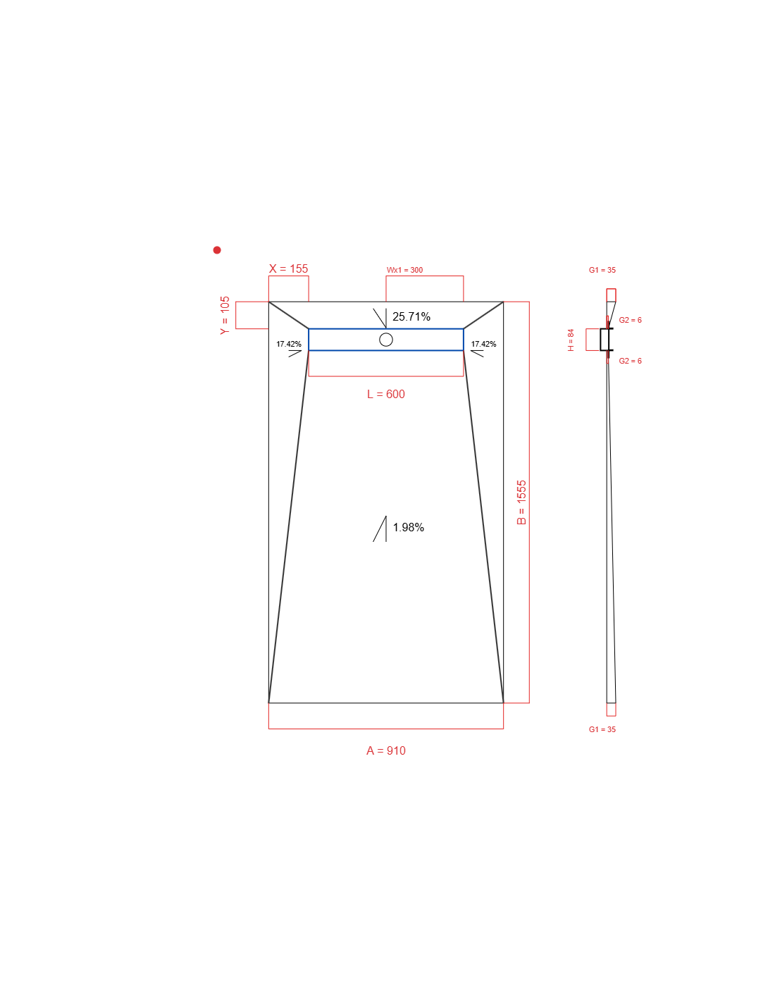 Laybase Wiper 4 way 910 x 1555 mm Duschrinne Premium Mistral 600 mm Brushed, stärke: 35 6 mm Ablaufposition: 300 mm, Siphon: McAlpine HC26 50