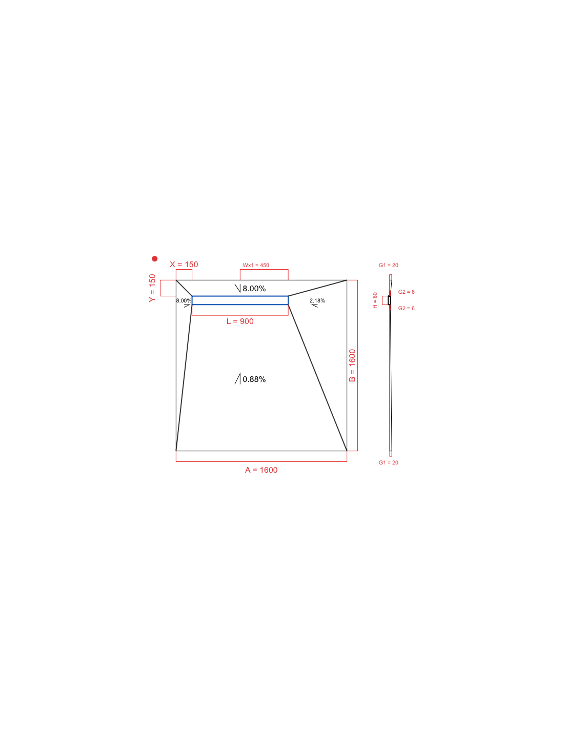 Showerlay Wiper 4 way 1600 x 1600 mm Duschrinne Invisible Invisible 900 mm Brushed, stärke: 20 6 mm Ablaufposition: 450 mm, Si
