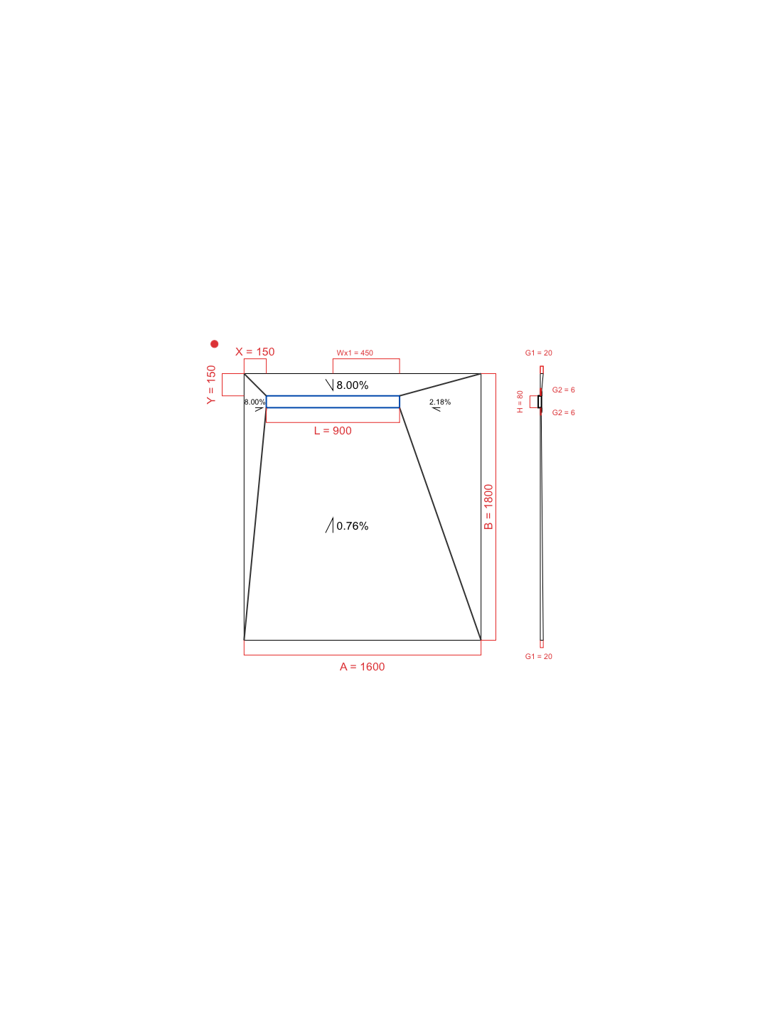 Showerlay Wiper 4 way 1600 x 1800 mm Duschrinne Invisible Invisible 900 mm Brushed, stärke: 20 6 mm Ablaufposition: 450 mm, Si